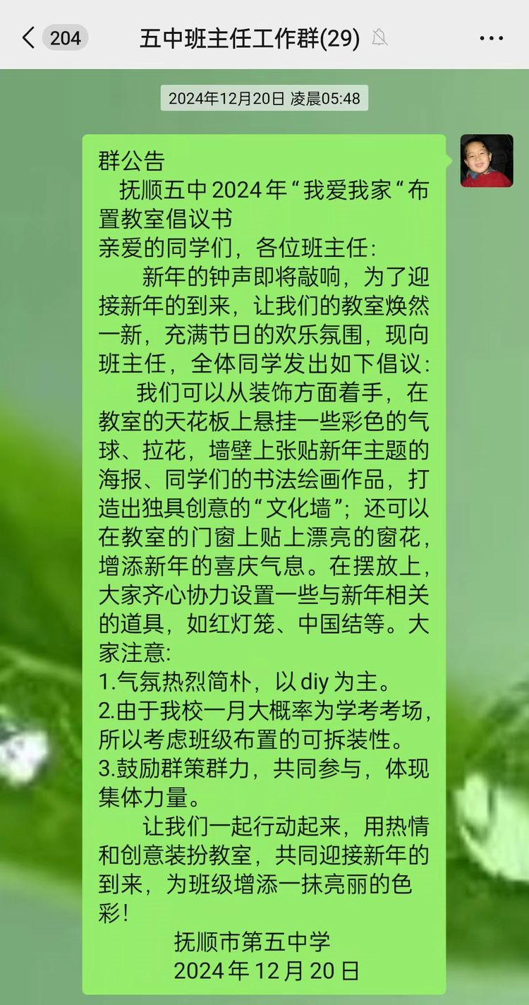 为了促进班级特色文化建设,树立良好班风学风,营造温馨和谐的学习环境,充分发挥环境育人的功效,培养学生的集体荣誉感,提升学生综合素质,抚顺市第五中学开展了“我爱我家”班级文化布置活动。 接下来,我们一起来看看各班级师生的精彩表现吧!
